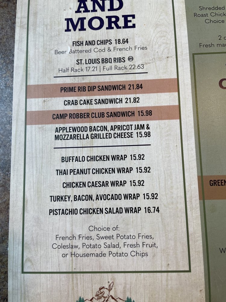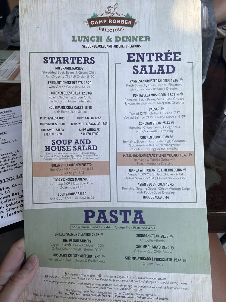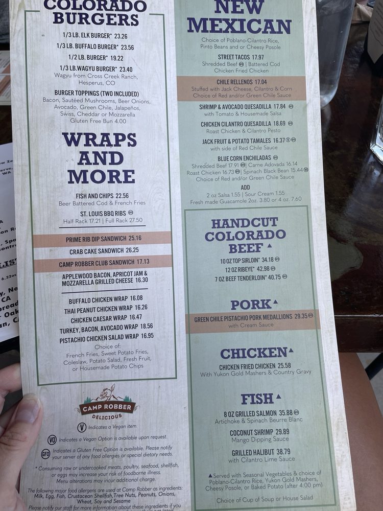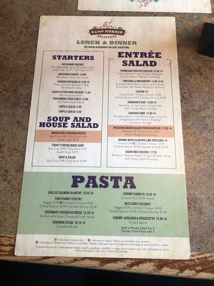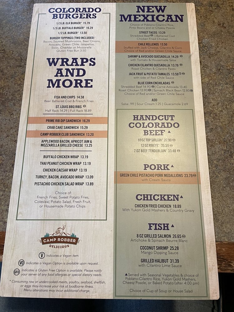 Introducing the menu at Camp Robber in Montrose, CO, a New American restaurant known for its diverse offerings. With a range of options for vegans and vegetarians, Camp Robber also caters to various dietary preferences. Customers rave about the outdoor seating, friendly service, and delicious dishes like the Chili Relleno. The atmosphere is described as clean, comfortable, and perfect for any occasion from family dinners to date nights. The menu is expansive, with something for everyone to enjoy. Camp Robber's attentive staff, unique specials, and overall ambiance make it a top choice for dining in Montrose. Whether you're a regular or a first-time visitor, Camp Robber is sure to impress with its flavorful cuisine and welcoming environment.